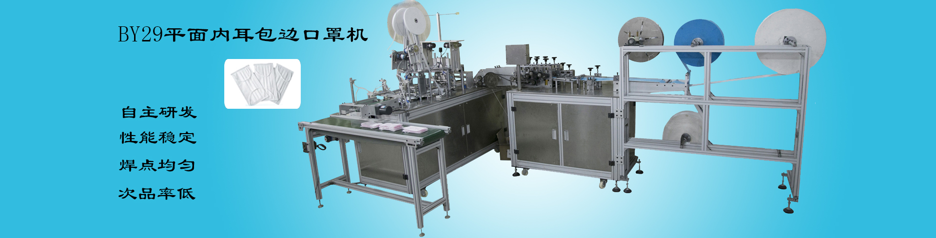 邦銀產(chǎn)品:全自動口罩機系列、無紡布口罩機系列、防塵防霧霾口罩機系列、平面/立體口罩機系列、全自動杯型/折疊(C型)/鴨嘴/梯形口罩機系列、口罩機維修和軟件升級以及改裝等服務、口罩機配件商城、八大系列上百款產(chǎn)品。同時,還能為用戶量身定制各種非標專用設備,充分滿足不同客戶對產(chǎn)品的個性化需求,在國內(nèi)外市場擁有較高的信譽,贏得了眾多知名企業(yè)的青睞與合作,產(chǎn)品除暢銷全國還遠銷到印度、俄羅斯、巴西、、墨西哥、馬來西亞、波蘭、南非及澳大利亞等跨五大洲的眾多國家和地區(qū)。